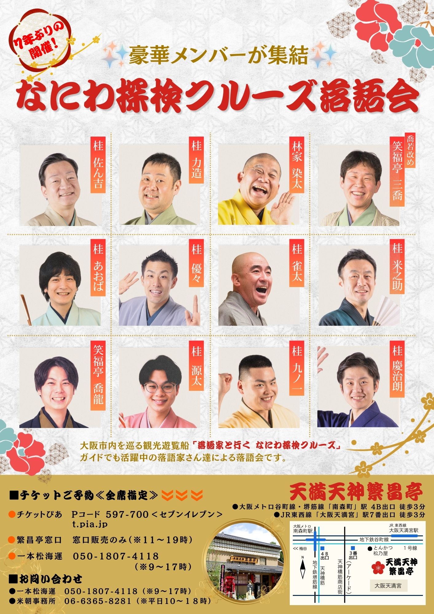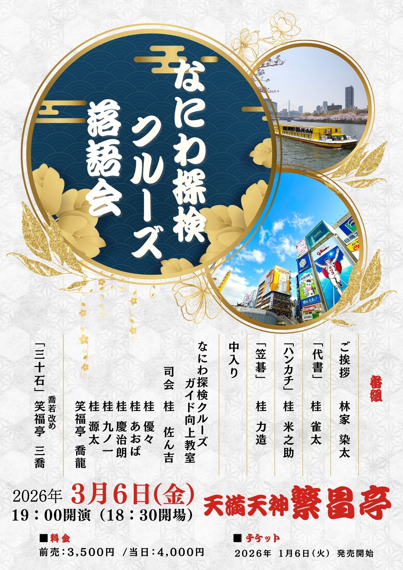 2026年3月6日(金) 落語会 開催決定!!! 「 落語家と行くなにわ探検クルーズ 」にご乗船されている落語家さんも多数出演! 詳細はHP・SNSでお知らせいたしますのでお楽しみに♪
